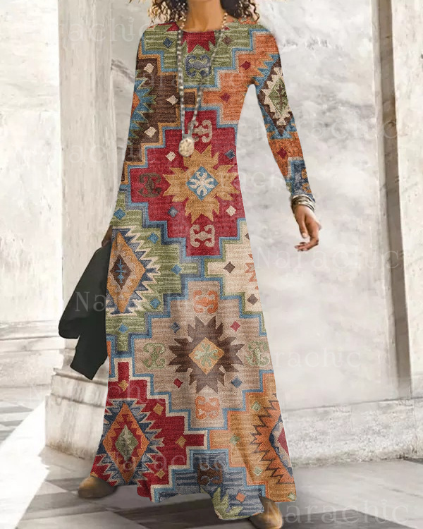• Ethnic Long Sleeve Crew Neck Casual Dresses