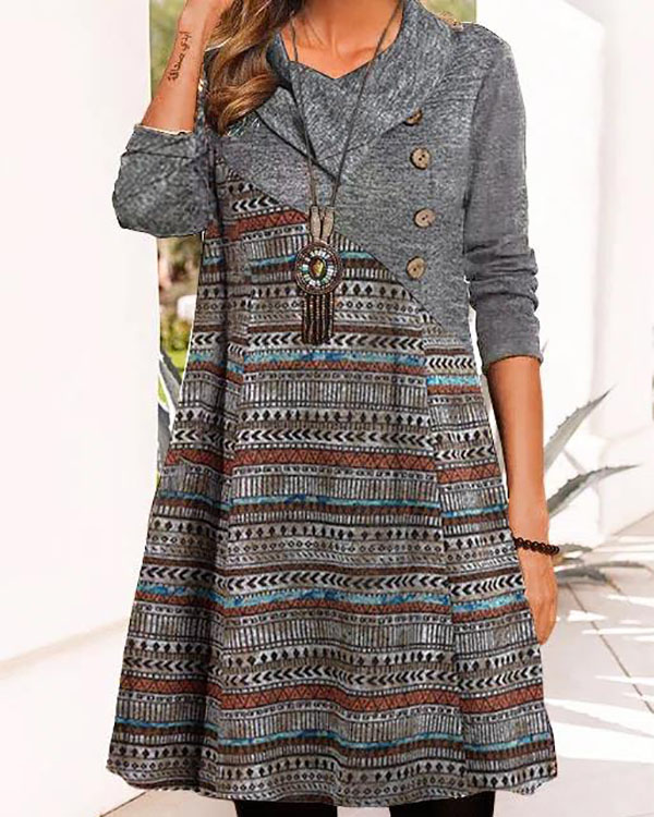 • Vintage Collar Button Print Long Sleeve Midi Dress